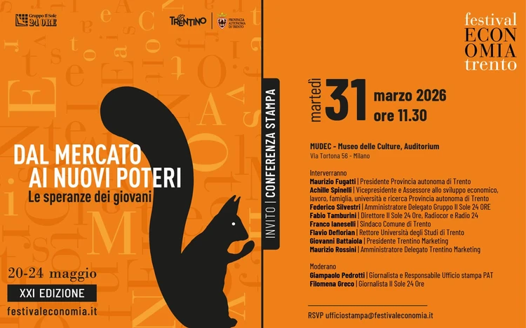 Martedì 31 marzo alle 11.30 all’Auditorium del MUDEC – Museo delle Culture di Milano sarà presentata la nuova edizione del Festival dell'Economia di Trento, in programma dal 20 al 24 maggio nel capoluogo trentino con il titolo “Dal mercato ai nuovi poteri. Le speranze dei giovani”. All’incontro interverranno il presidente della Provincia autonoma di Trento Maurizio Fugatti, il vicepresidente e assessore allo sviluppo economico Achille Spinelli, l’amministratore delegato del Gruppo Il Sole 24 ORE Federico Silvestri e il direttore del Sole 24 Ore, Radiocor e Radio 24 Fabio Tamburini, insieme al sindaco di Trento Franco Ianeselli, al rettore dell’Università degli Studi di Trento Flavio Deflorian, al presidente di Trentino Marketing Giovanni Battaiola e all’amministratore delegato Maurizio Rossini. La conferenza stampa sarà condotta dai giornalisti Giampaolo Pedrotti e Filomena Greco.